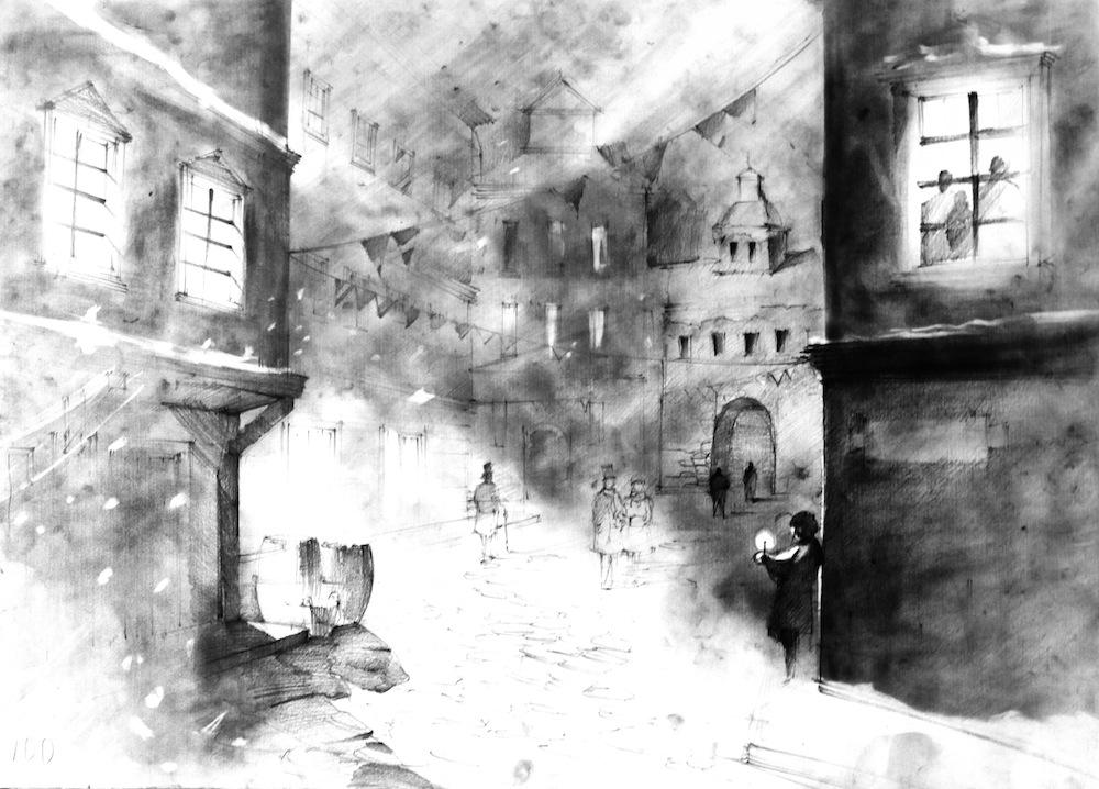 4. Ilustracja z elementami architektury (rys. 5). Celem jest tutaj ukazanie zrównoważonej sceny, gdzie architektura czy detale otoczenia są tak samo ważne co postaci, które się w niej pojawiają (one w tym samym stopniu określają przestrzeń, nastrój i skalę co budynki). Warto zwrócić uwagę, że postaci są rysowane podobną kreską i podobnie traktowane w stosunku do innych elementów sceny. Nie są tutaj może najważniejsze ale także nie są potraktowane jako czyste sylwety „tylko dla skali”. Jest to najlepszy sposób działania dla osób początkujących.